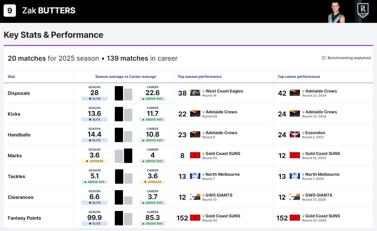 - Paragraph 2: Stat-based evidence (e.g., "With 22 disposals per game and 45 marks this season...")